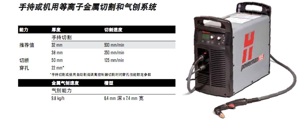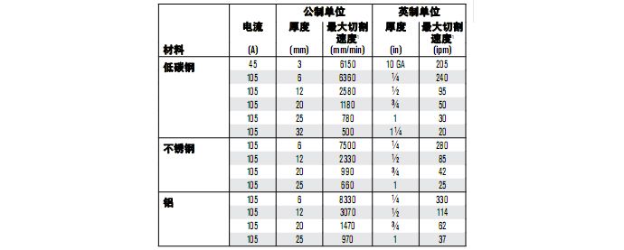 最大切割速度系根據(jù) Hypertherm 實驗室測試所得的結(jié)果。為實現(xiàn)最佳切割性能,實際切割速度可能會隨不同的切割應(yīng)用而有所不同。有關(guān)更多詳情,請參考《操作手冊》。